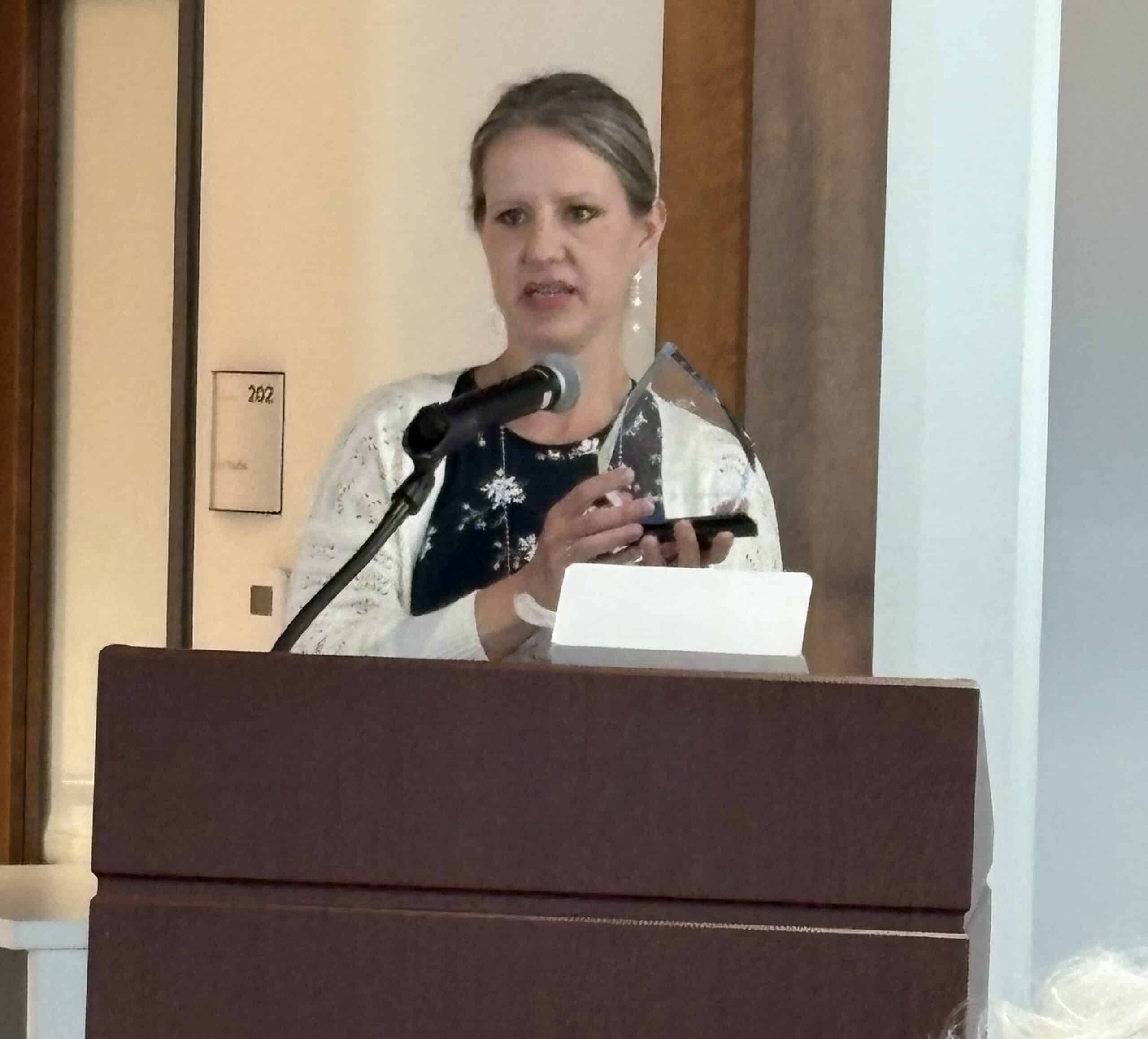 Amy Paukert was the recipient of the Service to the Profession Award, presented at the Conference Banquet. Amy Paukert was unable to be at the conference. In the picture, Amy Mercer, chair of the SPA award announces the recipient.
