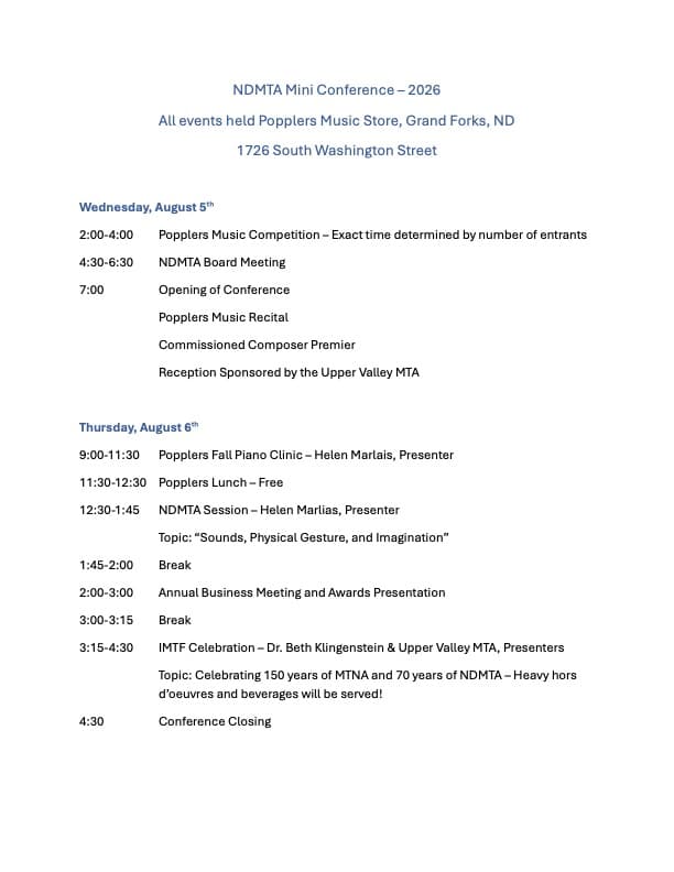 •The Popplers Competition will take place at the conference Wednesday, August 5th at 2:00 pm. Use this quick link to see information and registration: https://ndmta.org/student-events/popplers-music-competitions/